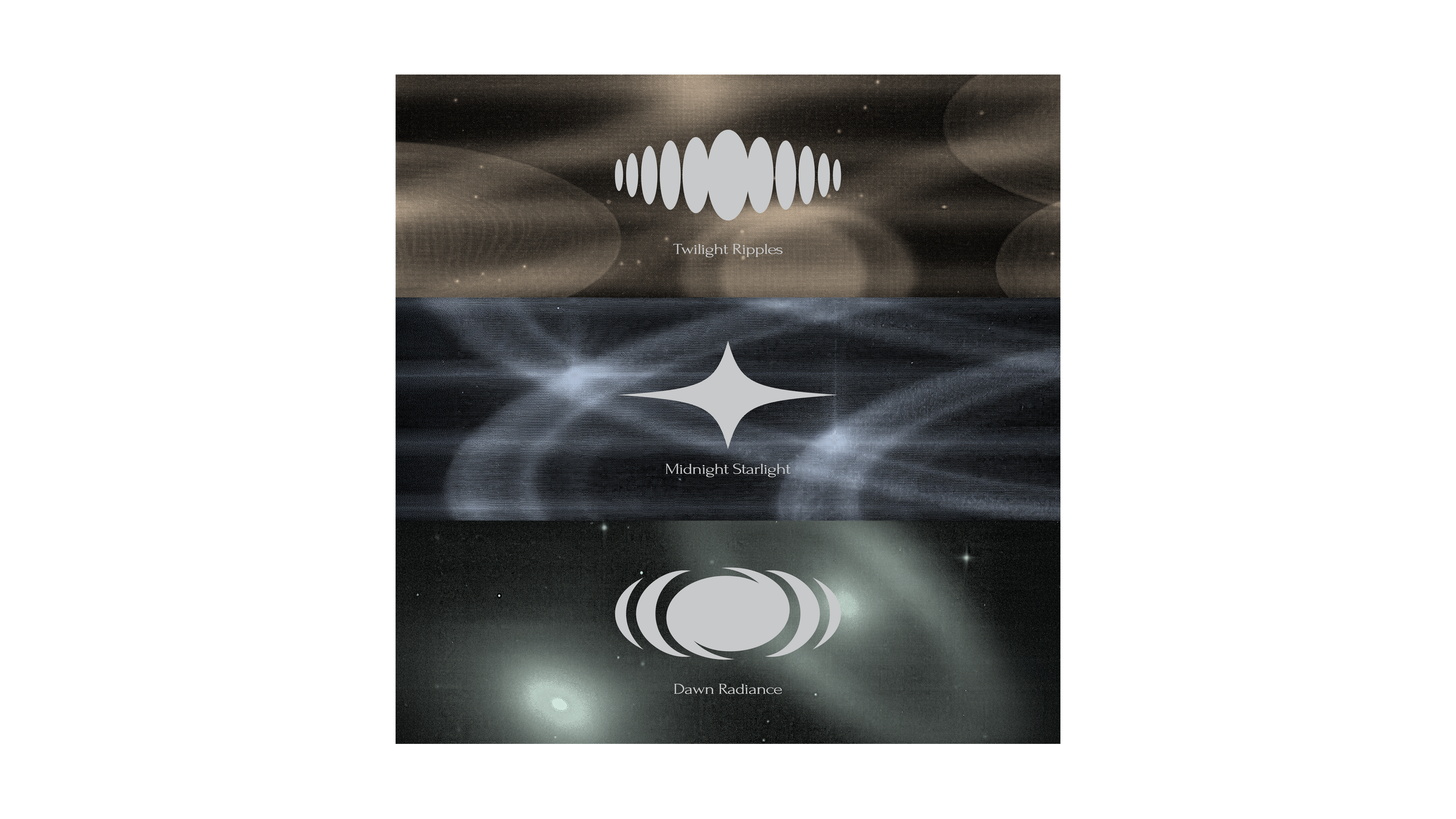 輔助圖形取材自三種意象——「黃昏漣漪」、「深夜星芒」、「清晨光耀」,象徵香氣的流轉與日常的陪伴,不論在何時何地,都能成為與自己對話的橋樑。