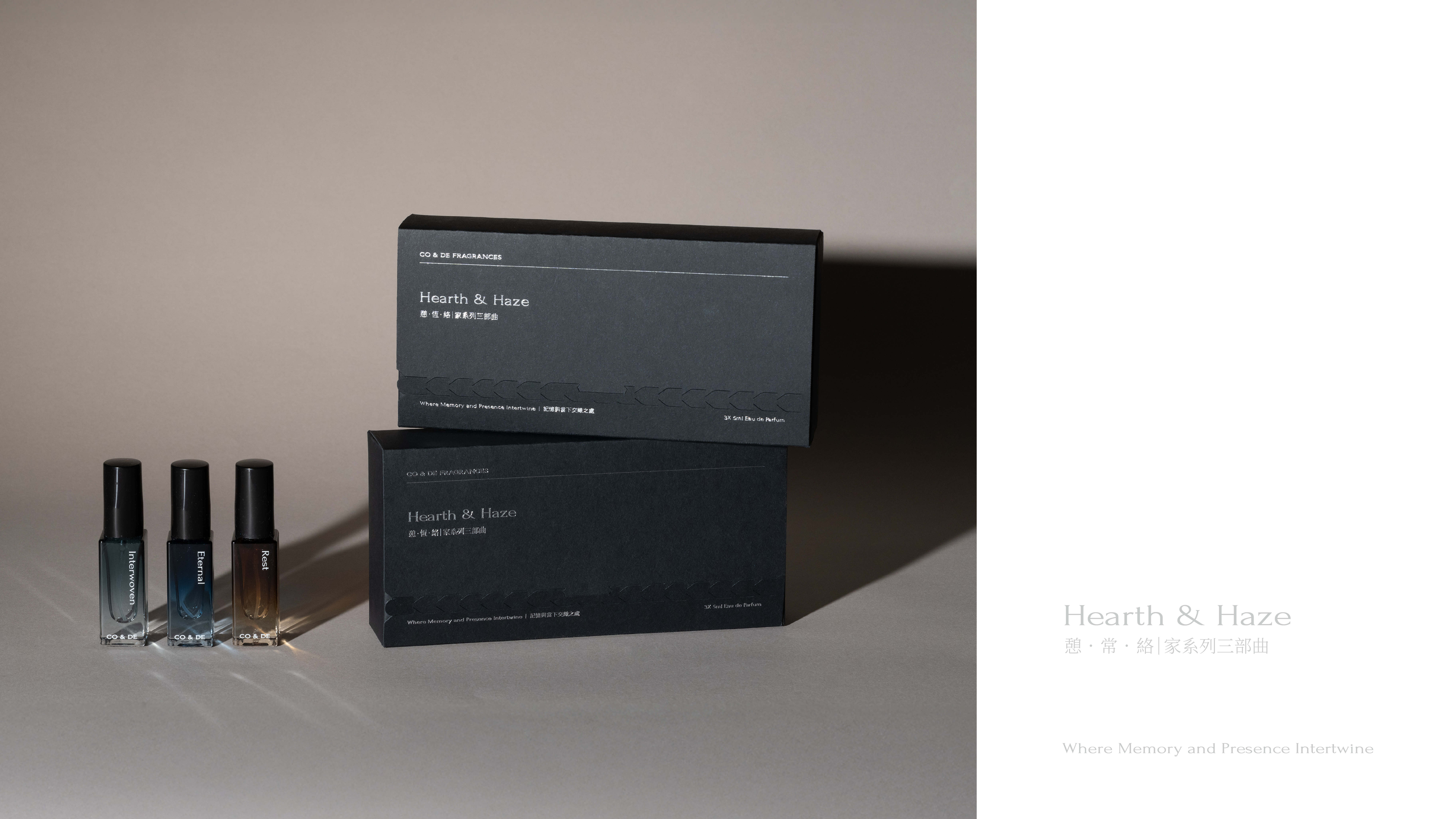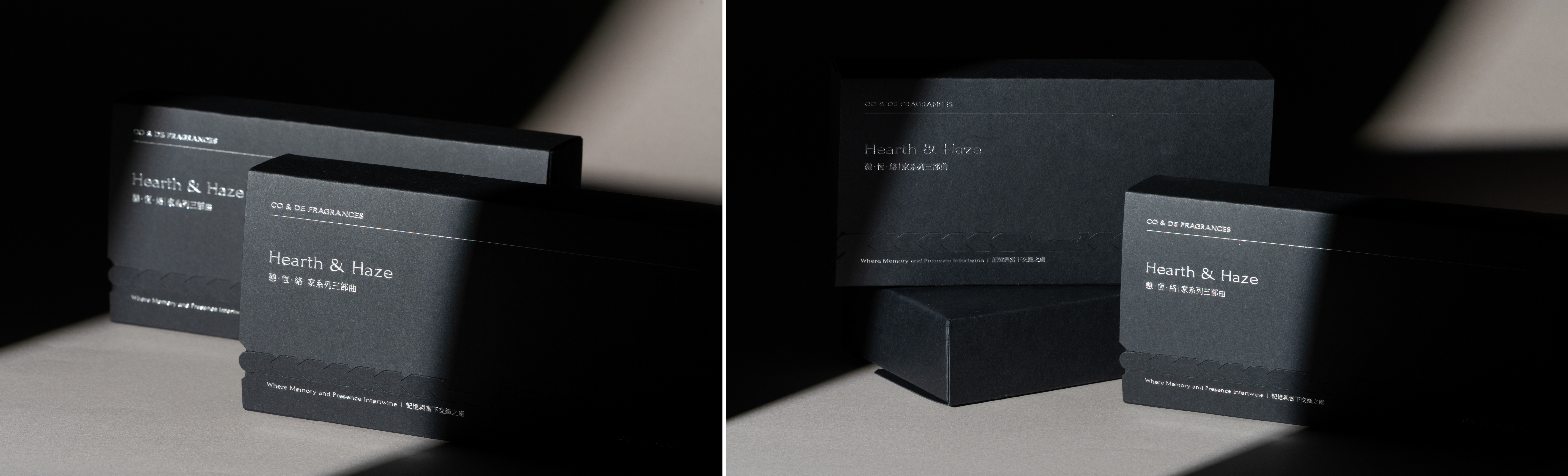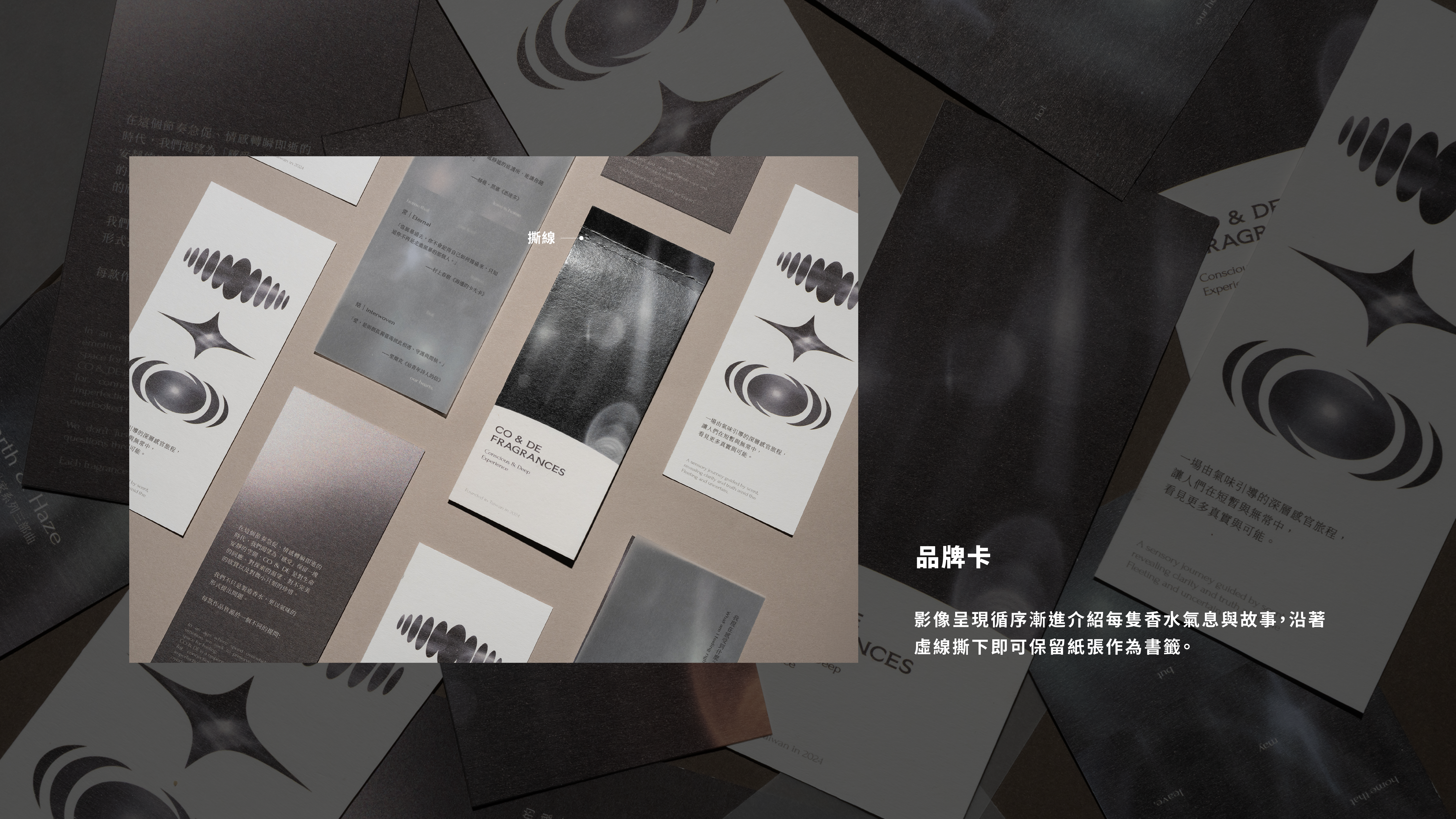 我們希望呈現符合 CO&DE 形象的氣息,禮盒選用黑卡燙銀將設計回到低調仍保有精緻的感受,也更著重在產品的文字敘事,品牌卡中的影像呈現循序漸進介紹每隻香水氣息與故事,沿著虛線撕下即可保留紙張作為書籤。