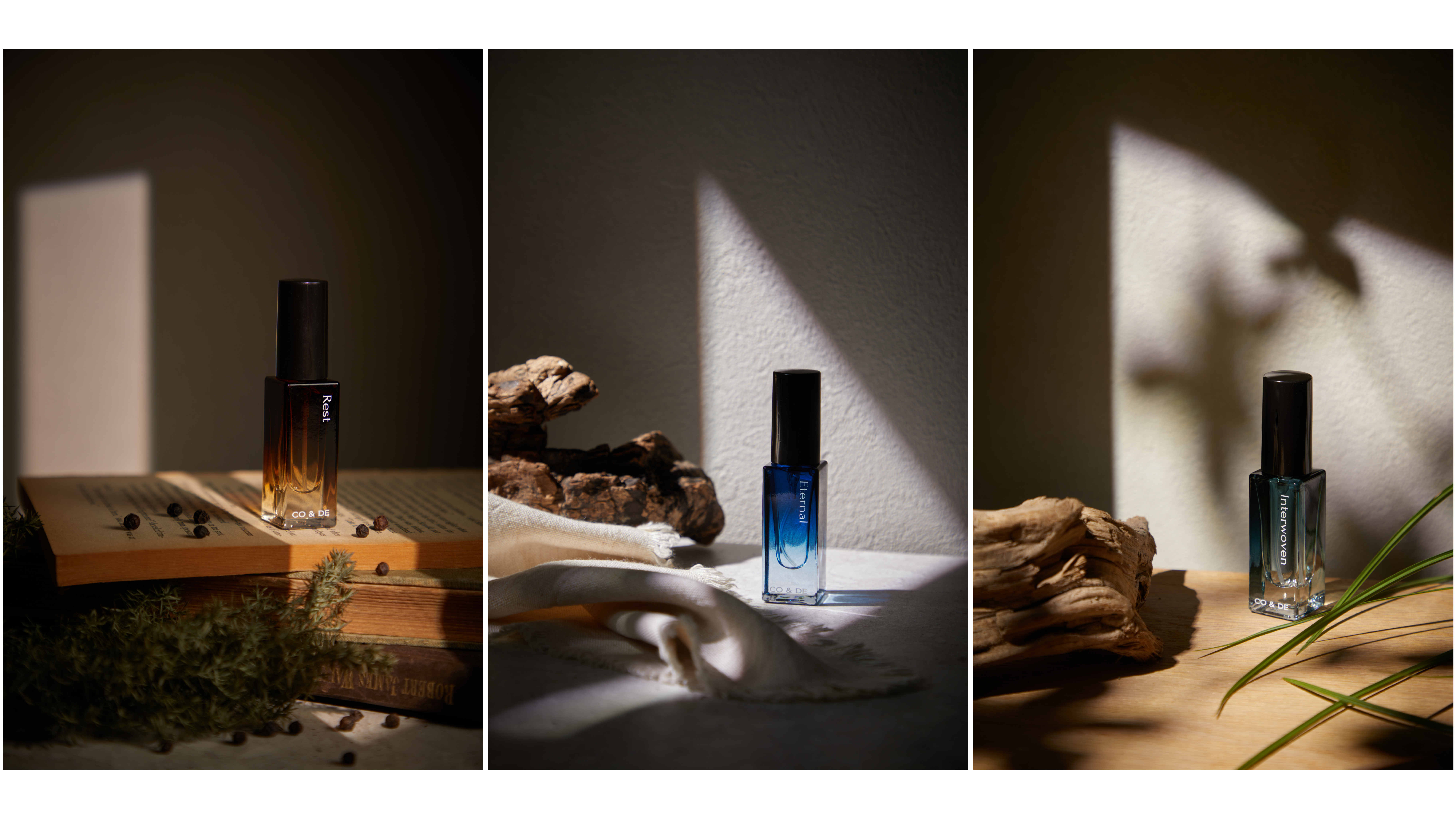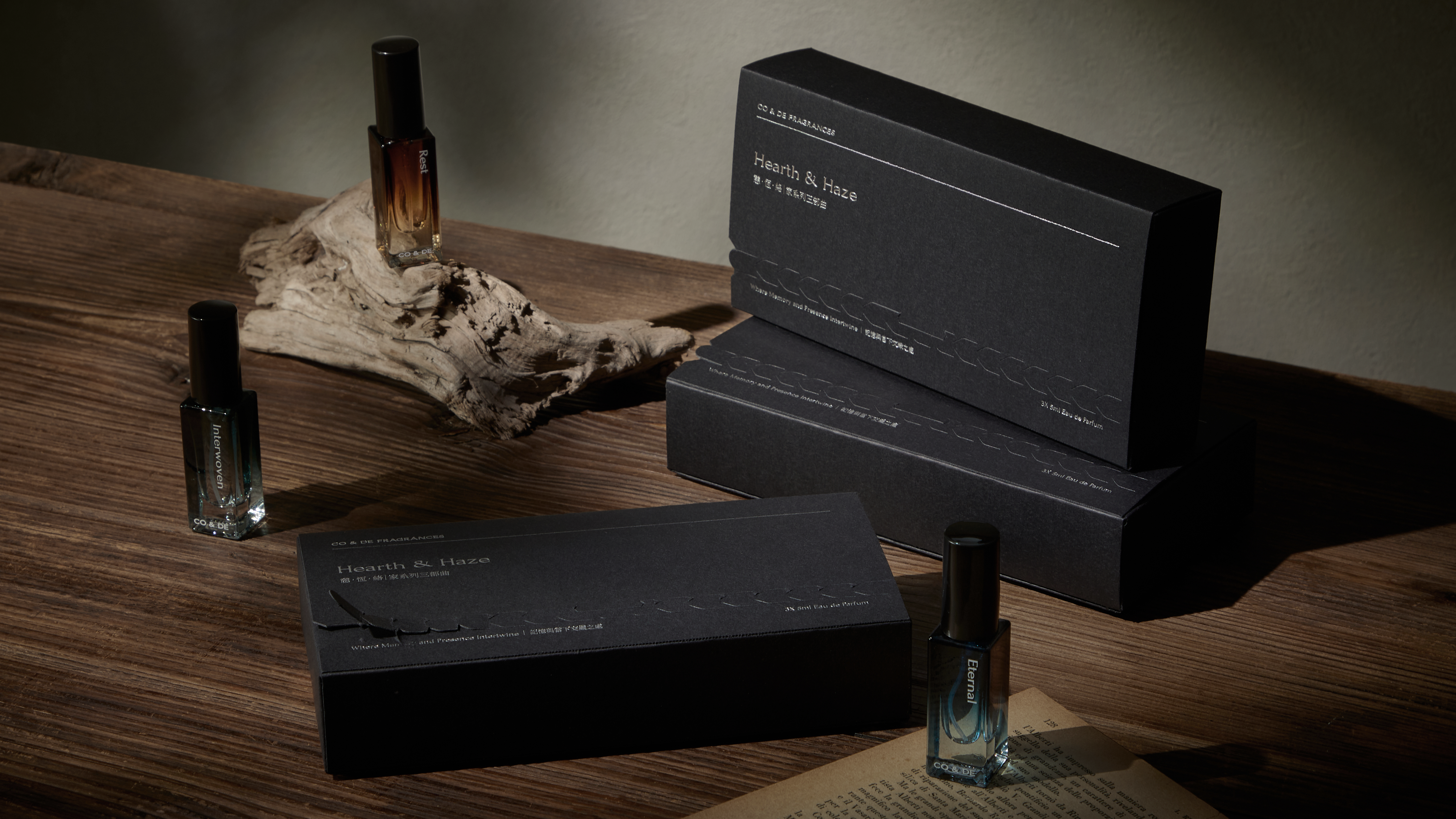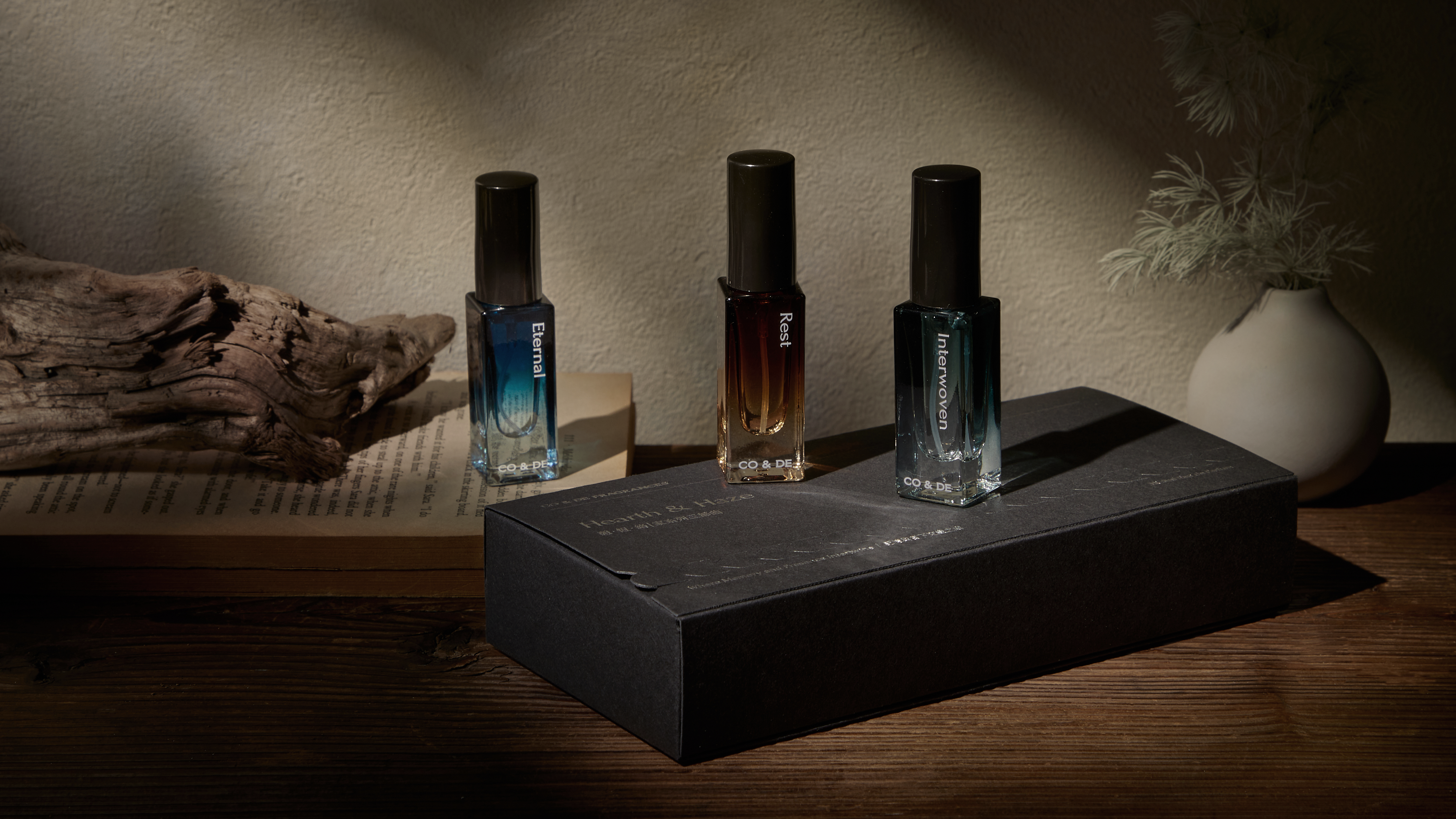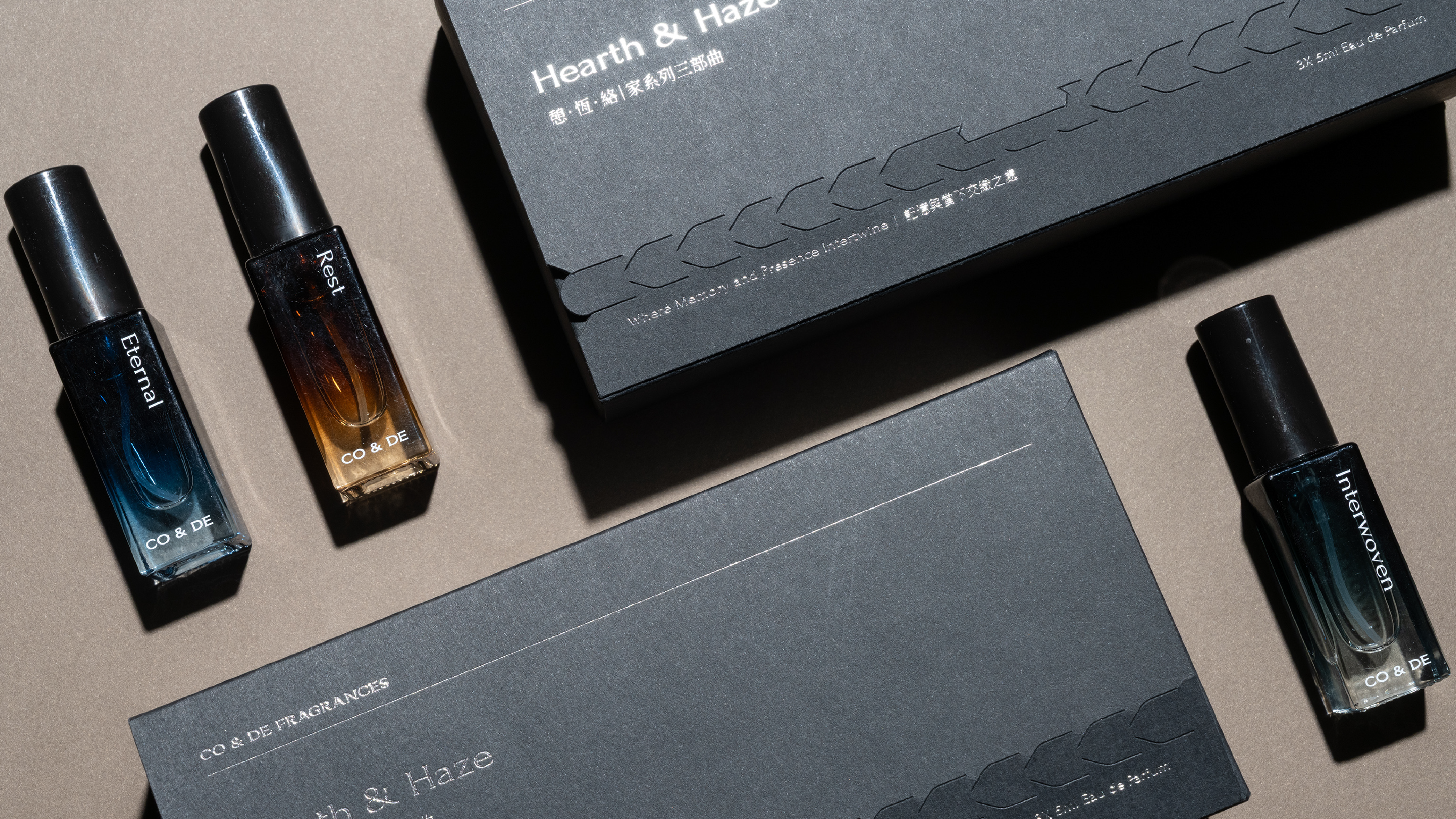 我們希望呈現符合 CO&DE 形象的氣息,禮盒選用黑卡燙銀將設計回到低調仍保有精緻的感受,也更著重在產品的文字敘事,品牌卡中的影像呈現循序漸進介紹每隻香水氣息與故事,沿著虛線撕下即可保留紙張作為書籤。